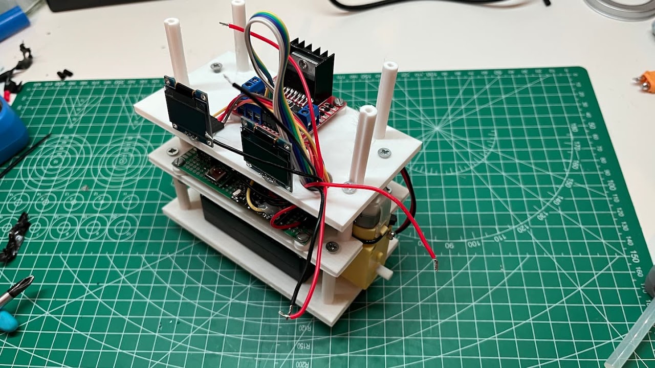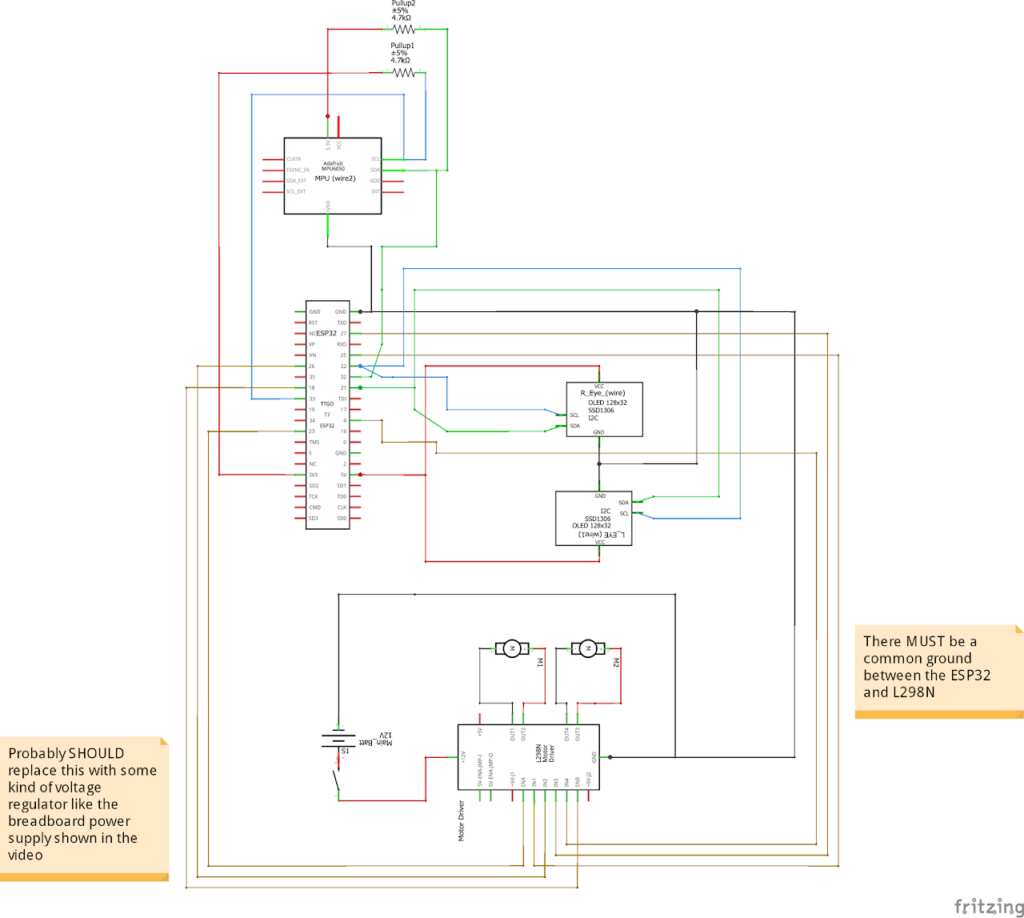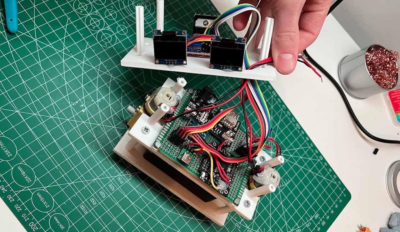 To solve these issues, we use a multi-bus I²C setup operating simultaneously (something many Arduinos do not support). We also run both OLED displays on the same address so the ESP-32 treats them as one component.