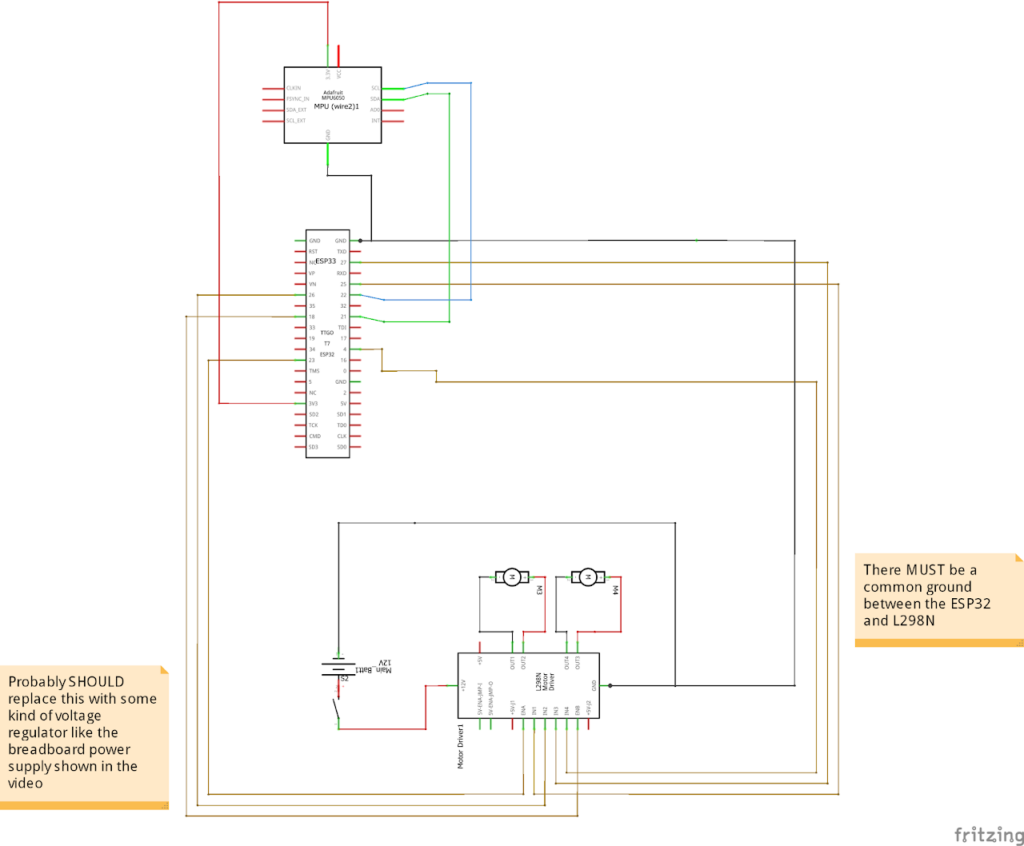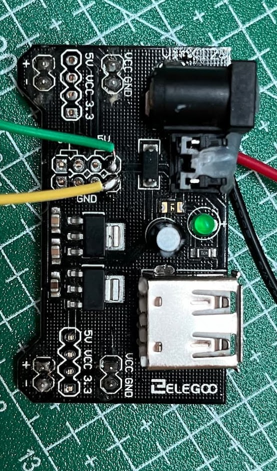 Mines a bit mangled, but if you google “breadboard power supply” then something similar will come up, in the schematics I use the 5V pin on the L298N to power the ESP-32, which would be fine but to quote ChatGPT “Short answer: don’t—at least not if you care about reliability.” (classic Ai response). Because it apparently is noisy and cannot provide enough current, especially during WI-FI bursts. I had this laying around so I went with it. You could replace this with any kind of buck voltage converter or risk it with the L298N. Do your own reasearch.