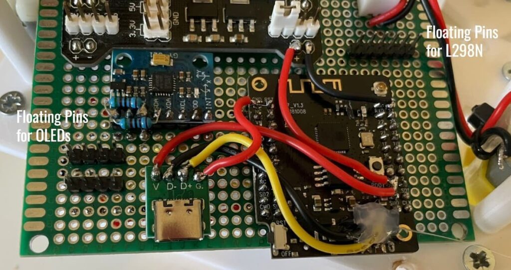 Next, make the main logic board for the robot. According to the correct schematic for your version (refer to section 2). You must leave connections for the L298N and OLEDs as empty pin headers so I could attach jumper wires later. When laying our your logic board, ensure the ESP-32’s USB port is accessible – we will need it later.