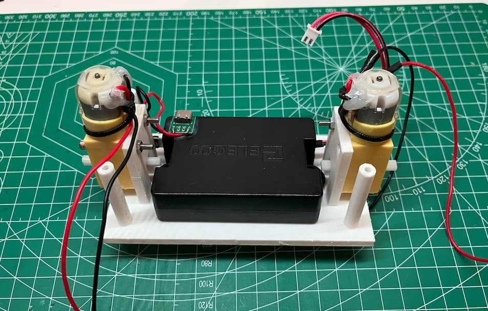 Using the smaller M3 screws and bolts, secure the logic board to the correct plate (4). You should ensure the ESP-32’s USB port is accessible. Then using the M3 self-tapping screws, attach the plate with the logic board to the bottom plate with the battery and motors. Make sure the motor wires are accessible like in the image. Now is also a good time to connect the battery leads to your logic board. I have added a JCT connector to the battery leads and logic board, but direct solder would be fine.