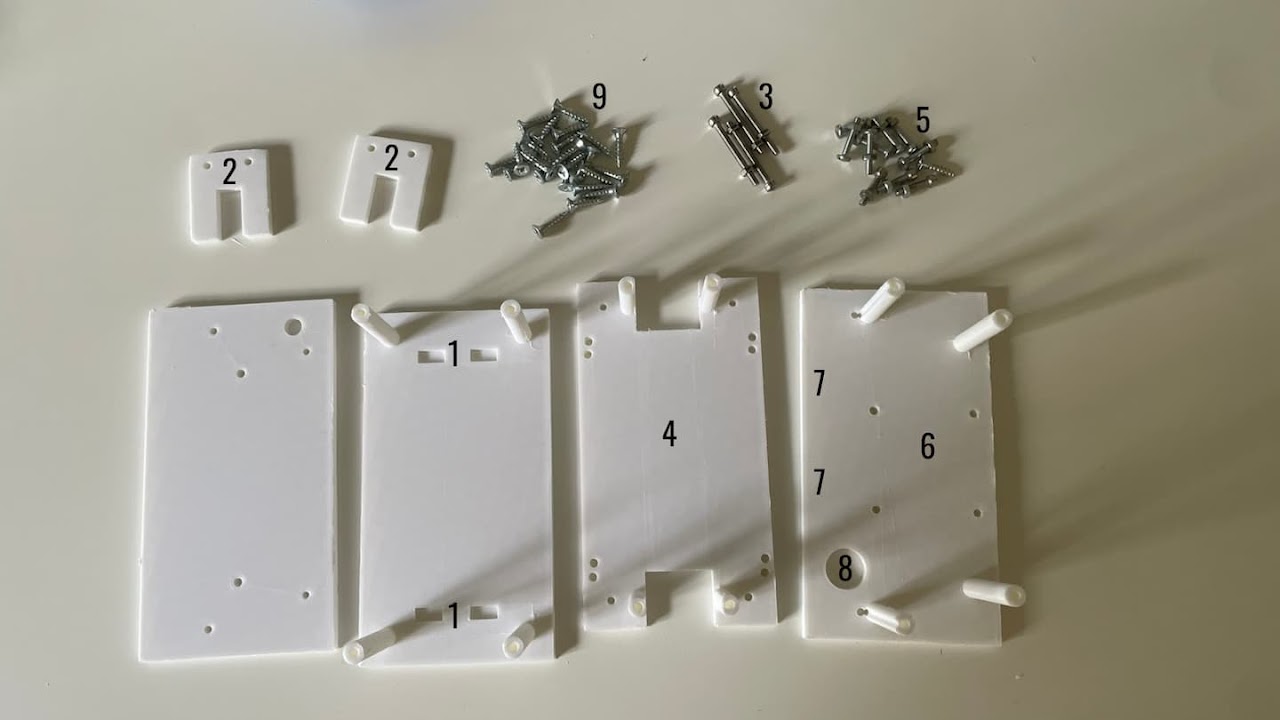 You should now gather all of the 3D printed parts, M3 nuts and bolts, M3 self-tapping screws.
