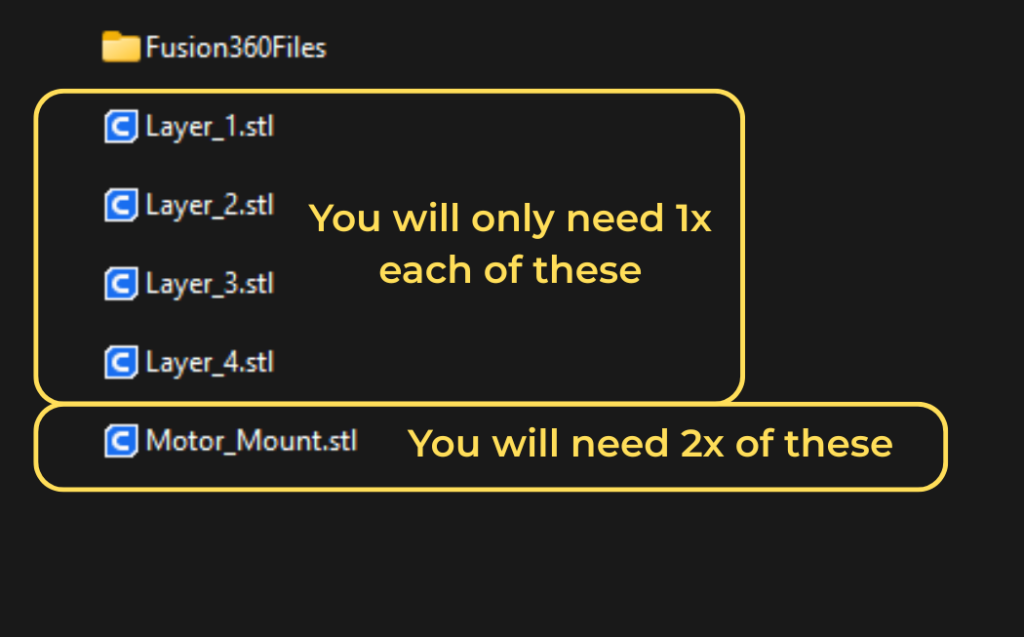 The project file you download earlier should contain a “3D Print files” folder. Within this folder, you should see the following: